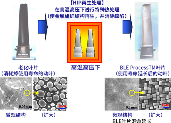 東芝對燃氣輪機的老化和使用壽命問(wèn)題進(jìn)行HIP再生處理,使葉片的材料組織結構和強度恢復到與新葉片同等的水平。HIP再生處理是在高溫高壓下通過(guò)特殊熱處理使金屬組織結構再生,并消除缺陷的技術(shù)。通過(guò)HIP再生處理,能夠大幅度地延長(cháng)造價(jià)昂貴的高溫零部件的使用壽命,從而降低維護成本。