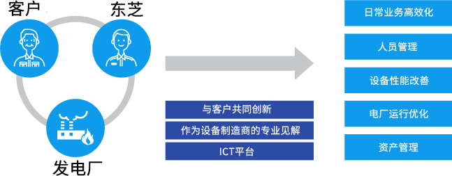 東芝為電廠(chǎng)設計的物聯(lián)網(wǎng)解決方案,不僅是單方面的提案,而且將客戶(hù)的電廠(chǎng)運行管理經(jīng)驗與東芝長(cháng)期積累的豐富專(zhuān)業(yè)技能知識及數據有效結合,針對客戶(hù)面臨的課題,共同創(chuàng )建解決方案。作為貼近客戶(hù)的合作伙伴,東芝將在機組的全生命周期內幫助客戶(hù)解決問(wèn)題。