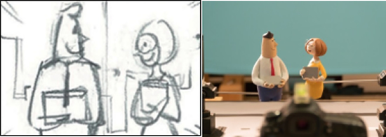 黏土動(dòng)畫(huà)的制作是一項極其繁瑣又細致的工作,動(dòng)畫(huà)人物的每一個(gè)動(dòng)作神態(tài)都要花費匠人們幾天的時(shí)間制作大量的原型。例如兩個(gè)“員工”在電梯中、公司里交流工作的場(chǎng)景,人物的每一次點(diǎn)頭、說(shuō)話(huà)、微笑、轉頭都是由不同神態(tài)、動(dòng)作的黏土元素需要分別拍攝完成;城市景象中的“車(chē)流”也是由工作人員不斷更換車(chē)輛位置進(jìn)行上百次拍攝合成。