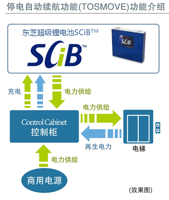 作為ELCOSMO-III型乘客電梯的專(zhuān)屬附加功能,“TOSMOVE”在發(fā)生停電之后將迅速切換至電池模式,以低速運行至最近樓層,并可在隨后保持0.5米/秒的速度續航長(cháng)達30分鐘。在續航過(guò)程中,電梯轎廂內的照明和換氣裝置可正常工作,為乘客提供便利。“TOSMOVE”系統模塊搭載東芝超級鋰電池SCiBTM,采用氯化物新型材料,較一般鋰電池具有更長(cháng)的使用壽命和更好的低溫特性。即使發(fā)生內部短路,緩慢電流也能有效抑制發(fā)熱,確保使用安全性。