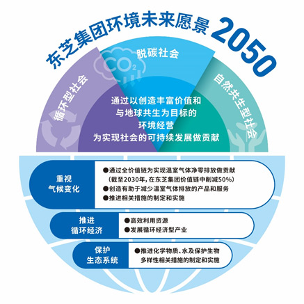 東芝集團環(huán)境未來(lái)愿景2050的目標是“通過(guò)以創(chuàng )造豐富價(jià)值和與地球共生為目標的環(huán)境經(jīng)營(yíng),為實(shí)現社會(huì )的可持續發(fā)展做貢獻”,從而實(shí)現脫碳、循環(huán)型、自然共生型可持續發(fā)展社會(huì )。同時(shí),東芝還將繼續采用在2007年制定前一展望時(shí)所使用的“反推法*3”,并在“重視氣候變化”、“推進(jìn)循環(huán)經(jīng)濟”、“保護生態(tài)系統”三個(gè)領(lǐng)域繼續加大工作力度。